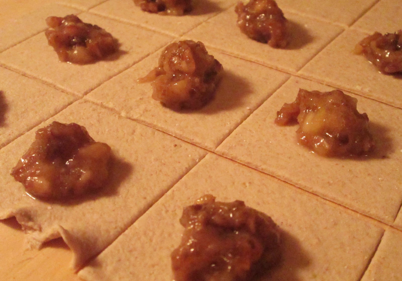 | Put the stuffing on 6cm wide squares of pasta. You can't make it thin this time: it would destroy. |